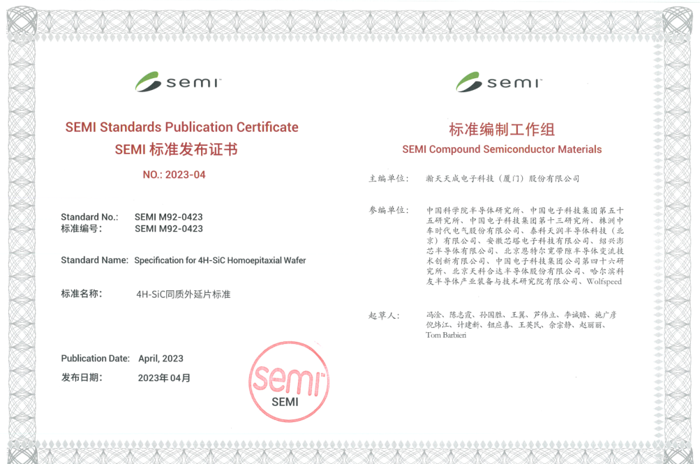 SEMI中国化合物半导体标委会标准发布证书
